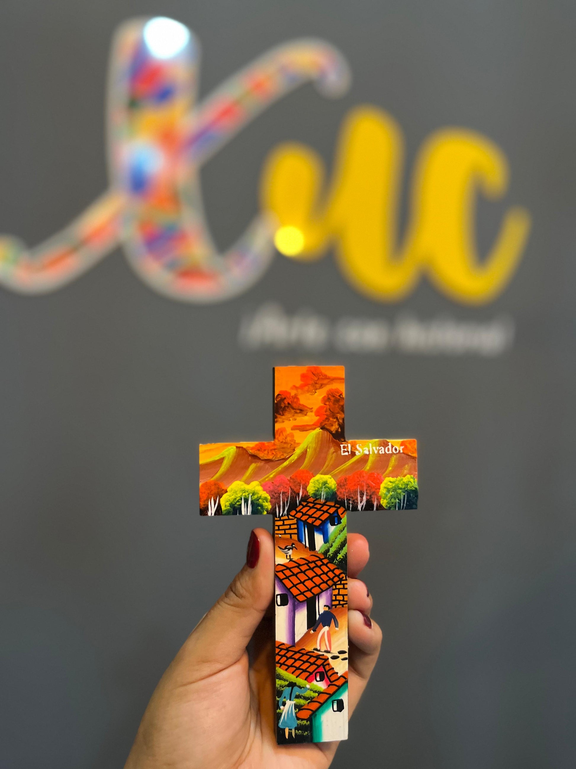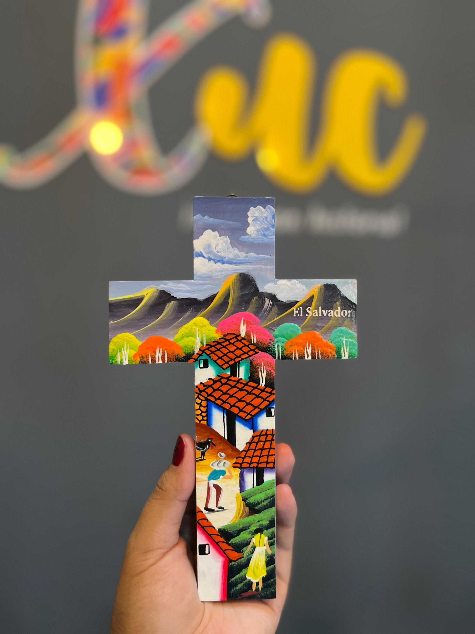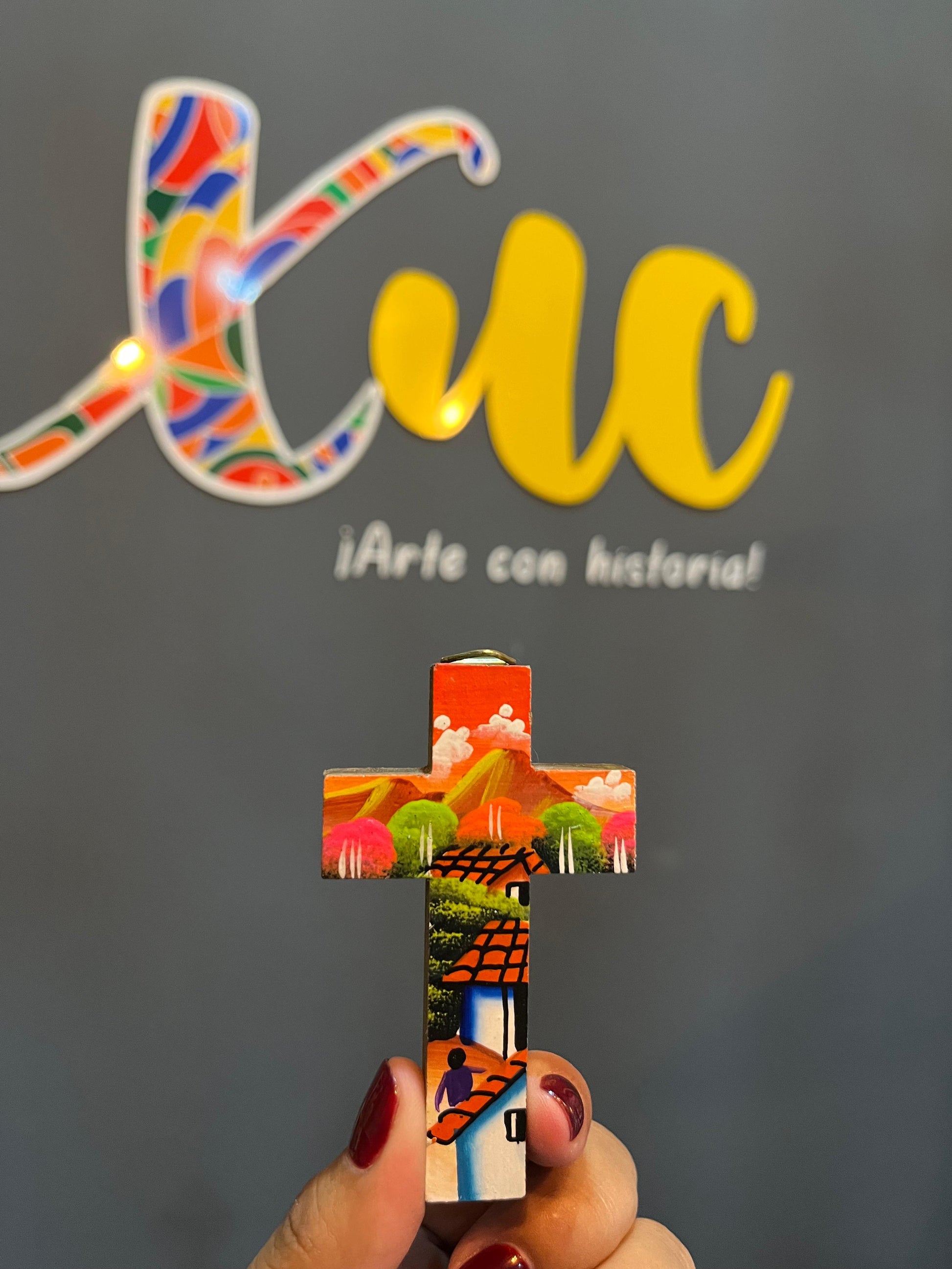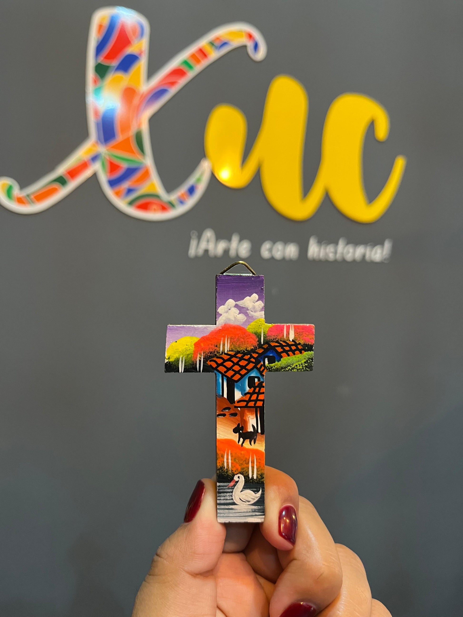 Cruces elaboradas en madera con diseños de paisajes en tamaños pequeños